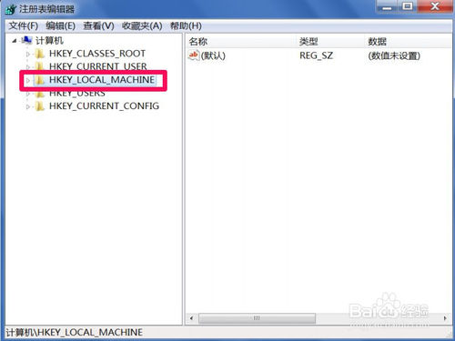 進(jìn)入注冊(cè)表編輯器后,先選擇根鍵[HKEY_LOCAL_MACHINE]這一項(xiàng)。