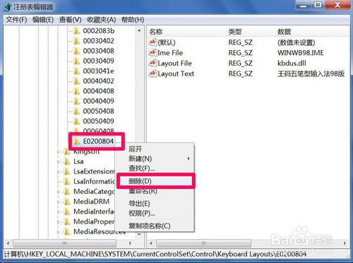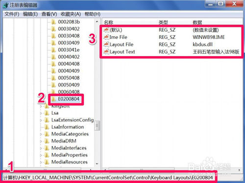 然后依次打開(kāi)如下路徑[HKEY_LOCAL_MACHINE\SYSTEM\CurrentControlSet\Control\Keyboard Layouts\E0200804],選定E0200804這一項(xiàng),在右側(cè)窗口,看看是不是有“WINWB98.IME”和“王碼五筆型輸入法98版”這類(lèi)信息,如果有,則證明E0200804是專(zhuān)屬王碼五筆的注冊(cè)項(xiàng)。