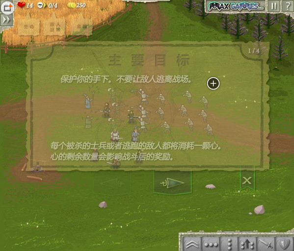 游戲中主要目標(biāo)就是保護(hù)你的手下,不要讓敵人逃離戰(zhàn)場。每當(dāng)犧牲一個(gè)士兵或者有一個(gè)敵人逃跑都要消耗一顆心,心的剩余數(shù)量會影響到戰(zhàn)斗后的獎(jiǎng)勵(lì)。每個(gè)單位在面對6個(gè)敵人時(shí),不會被其余的敵人近戰(zhàn)攻擊。如果一個(gè)單位退出戰(zhàn)斗,則立刻會被敵人的背刺擊中,但如果有兩個(gè)或以上的單位共同攻擊同一目標(biāo)時(shí)該情況不會發(fā)生。當(dāng)單位被快速移動(dòng)的敵人包圍時(shí)不能退出戰(zhàn)斗。