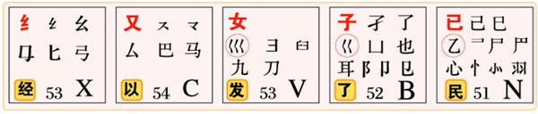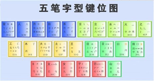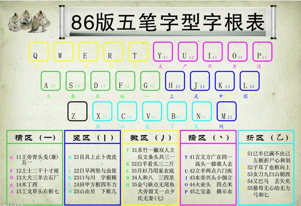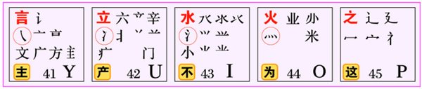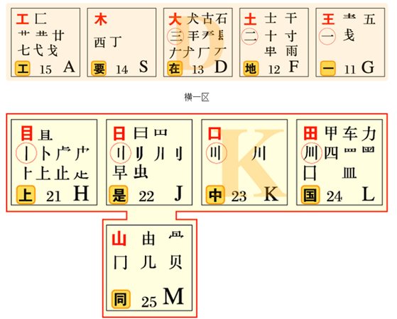 其次,五種基本筆劃分布于鍵盤26個英文字母中的A到Y(jié)上,Z則用作學(xué)習(xí)鍵(也稱萬能鍵)。