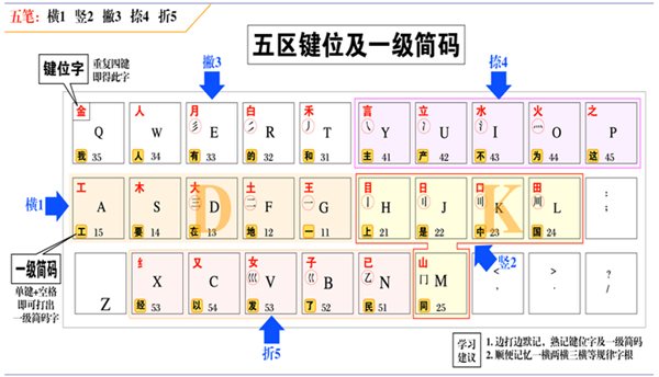 1、首先邊打邊默記五區(qū)鍵位及一級簡碼,見下圖: