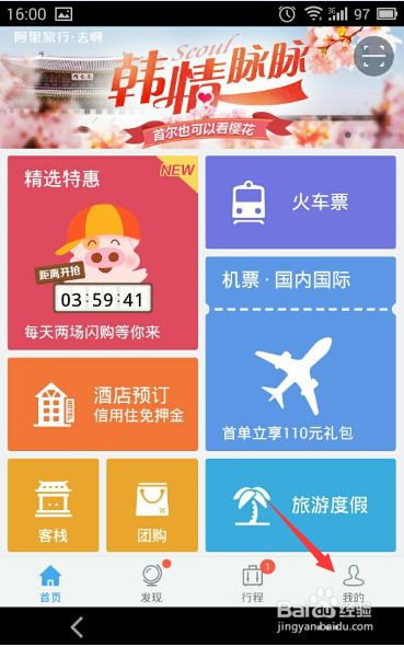 2、這里演示是阿里旅行去啊已經(jīng)登錄過程,點擊【我的】,即桌面的右下角