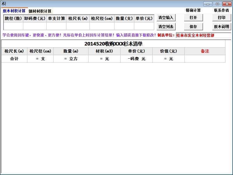 1、鋸材材積計(jì)算價(jià)格最適合做生意者使用;(因?yàn)楸拒浖?jì)算的價(jià)值全部是只保留整數(shù)即小數(shù)點(diǎn)后的數(shù)全部去掉);