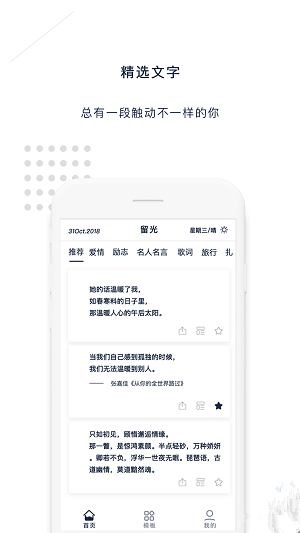 2、精簡的交互操作,文字與配圖融合,在留光,你可以發(fā)現(xiàn)與收藏這些你有所觸動的句子;