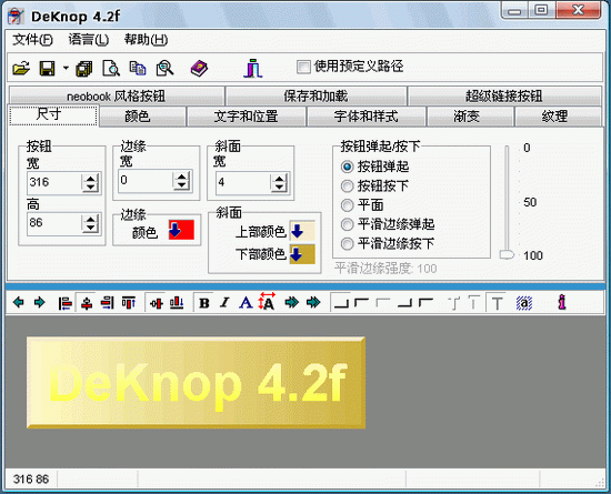 DeKnop 是一個專門制作按鈕的工具軟件,他提供 step-by-step 的接口,只要一步一步輸入相關(guān)的信息,便可以完成各式各樣立體的按鈕。 網(wǎng)頁上面常會用到許多按鈕,DeKnop 可以讓使用者不需用到任何繪圖軟體就可以做出各式各樣立體的按鈕,而且迅速又方便。DeKnop 提供 step-by-step 的介面,只要按照標簽的順序,尺寸、顏色、文字、顏色、漸層,一步一步輸入相關(guān)的資訊,便可以完成按鈕的制作。完成後的按鈕能夠儲存為 bmp 或 png 檔案,亦可儲存成專案檔,供下次繼續(xù)使用。除此之外,DeKnop 還有預覽、一次完成多個按鈕、字首/字尾命名、按鈕自動按下效果等功能。
