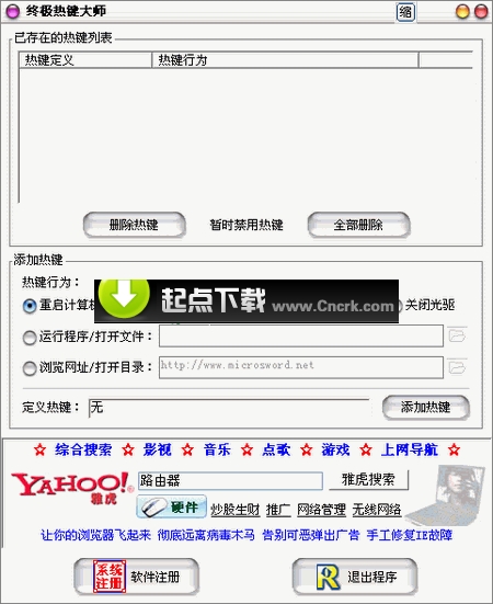終極熱鍵大師 V1.96 簡體中文綠色特別版 終極熱鍵大師是一款優(yōu)秀的熱鍵輔助工具,她可以讓您方便的定義自己的熱鍵。您可以通過自定義熱鍵的方式方便地實(shí)現(xiàn)用熱鍵打開指定文件或目錄、瀏覽網(wǎng)址、運(yùn)行程序、彈出/閉合光驅(qū)、重啟/關(guān)閉系統(tǒng)等操作
