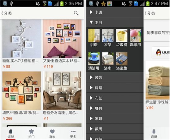 創(chuàng)意家居用品采用瀑布流形式展現(xiàn)!內(nèi)置淘寶購物功能直接與淘寶系統(tǒng)對接,而且還提供淘金幣積分消費(fèi),購物更方便!