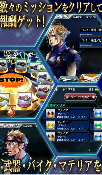 最終幻想7 G-BIKE iOS版是由SQUARE ENIX公司打造的一款iOS平臺(tái)摩托車(chē)跑酷游戲,最終幻想7 G-BIKE以《最終幻想7》中金碟游樂(lè)場(chǎng)里一個(gè)小游戲?yàn)榛A(chǔ),并加以現(xiàn)代技術(shù)重制而成的新作,玩家需要控制的男主角克勞德駕駛摩托戰(zhàn)車(chē),一邊避開(kāi)障礙物不斷前進(jìn),一邊擊退路上的各種敵人。游戲擁有刺激酷炫的飆車(chē)追逐戰(zhàn)、養(yǎng)成系統(tǒng)以及其他各種要素,是一款上手輕松的正統(tǒng)競(jìng)速游戲!