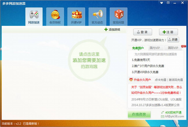 1.打開多多網(wǎng)游加速器客戶端,登錄你的賬號之后,點“添加游戲”如下圖