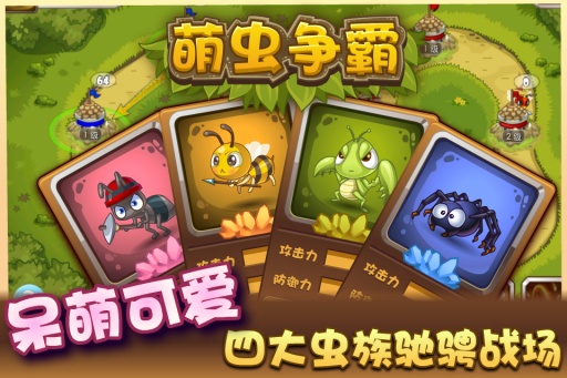 《萌蟲爭霸》是一款蟲子之間的策略塔防游戲,游戲的戰(zhàn)斗緊張刺激,操作輕松活潑,融合了生產(chǎn)造兵、塔防、基地升級、酷炫魔法等,以4大蟲族戰(zhàn)斗為主旋律,主題鮮明,畫風(fēng)可愛。游戲中共有21個(gè)風(fēng)光各異的地圖場景,12種狂拽酷炫的魔法技能,快速攻防轉(zhuǎn)換,挑戰(zhàn)你的策略和布局。是不是很刺激,喜歡的玩家趕快下載體驗(yàn)一番吧。【游戲特點(diǎn)】