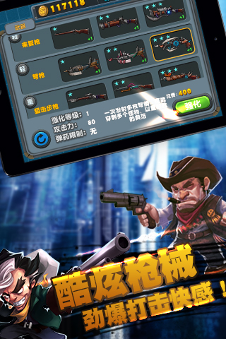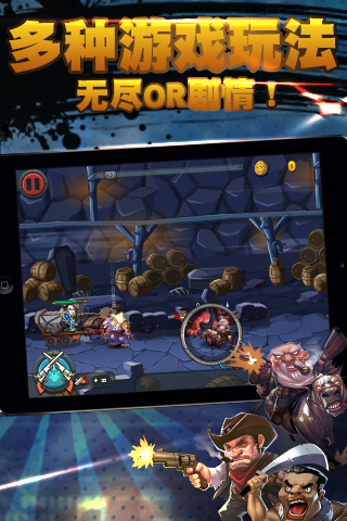 荒野通緝令是一款以美國西部牛仔為背景,融入了西式奇幻元素的橫版射擊游戲。它以手感流暢的爽快射擊為載體,用用Q版的美漫的夸張畫風(fēng)展現(xiàn)給玩家一個獨(dú)特的西部荒野。用各種不同的武器進(jìn)行搭配組合,來面對具有不同特點(diǎn)的敵人。