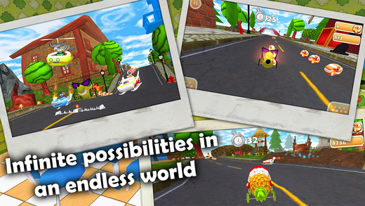 其他的同類(lèi)游戲,也許會(huì)采用重力感應(yīng)的操控方式,但本作則是采用雙手并用,左右點(diǎn)擊屏幕兩側(cè)來(lái)操控水果賽車(chē)的前進(jìn),有趣的虛擬按鍵一左一右,原本小編還以為一個(gè)是加速一個(gè)是減速,然而萬(wàn)萬(wàn)沒(méi)想到兩個(gè)都是減速,這這這...顯得有些多余。沿路我們會(huì)吃到許多有趣的道具和糖果,道具可以讓水果賽車(chē)變換超級(jí)形態(tài),而糖果則可以讓你在沒(méi)有吃到道具的情況下,到商店里自行選購(gòu);除了遇到有益的元素之外,我們還會(huì)碰到擾人的對(duì)手,一直阻擋著你的去路,巧妙躲避并超越它們還是需要一定技巧的。
