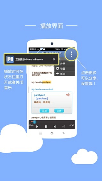 一、 愛語吧獨(dú)家聽英語經(jīng)典歌曲同時(shí)學(xué)習(xí)應(yīng)用的創(chuàng)新應(yīng)用,對(duì)每首英語歌曲一句句地語法詞匯解析,深度實(shí)現(xiàn)了“聽歌”學(xué)英語。二、 軟體資料由知行英語專業(yè)英語團(tuán)隊(duì)解析,精心挑選近兩百首英文歌曲,中英文同步對(duì)照,在聽覺上、視覺上充分滿足您的需求。