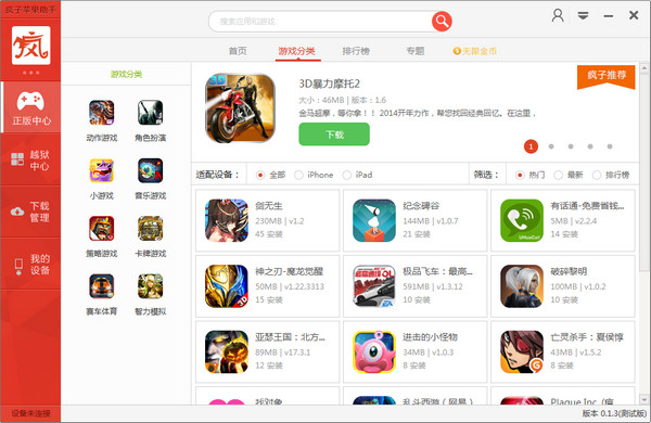瘋子蘋果助手的界面圖標(biāo)做的挺大的個(gè)兒,功能一目了然,正版中心、越獄中心、下載管理等等,相信使用蘋果手機(jī)的用戶,一看就知道是干嗎用的