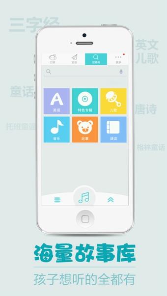 國(guó)內(nèi)最大的兒童聽(tīng)平臺(tái),上千萬(wàn)家長(zhǎng)的選擇,海量原創(chuàng)、獨(dú)家、正版兒童故事庫(kù)!手機(jī)變成故事機(jī),孩子身邊的故事大王!適合0-10歲兒童及家長(zhǎng)使用。提供媽媽和寶貝最愛(ài)的胎教音樂(lè)、兒歌童謠、兒童故事、英語(yǔ)abc、睡前童話、唐詩(shī)三字經(jīng)、小學(xué)課文等有聲讀物。孩子想聽(tīng)的這里都有!