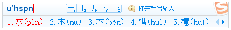 僅通過(guò)輸入文字構(gòu)成筆畫的拼音首字母來(lái)打出想要的字。例如:【木】字由橫(h)、豎(s)、撇(p)、捺(n)構(gòu)成,因此: