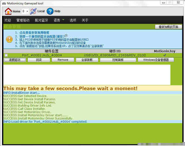 接著即可插入手柄,然后點擊管理驅(qū)動,等待自己的手柄出現(xiàn),如果沒能刷出手柄的話可以嘗試重新打開程序,應(yīng)該大部分手柄都是可以識別出來的。在找到的手柄中的前面打勾,然后選擇裝載驅(qū)動,然手等一會,程序就會為之安裝驅(qū)動了,下圖就是成功安裝驅(qū)動的提示。