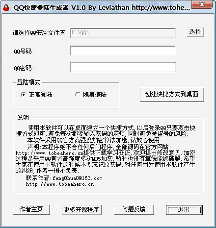 使用本軟件可以在電腦桌面創(chuàng)建一個QQ的快捷登陸方式,以后登陸QQ,只需要雙擊運行這個快捷方式,避免了輸入QQ號和密碼的麻煩,同時也從根本上防止了QQ被盜(因為QQ盜號一般采用鍵盤記錄,這里避免了輸入密碼,所以可以絕對避免盜號).本軟件采用騰訊官方提供的高強度多次MD5加密法,只能正向加密,不能進行反向解密,所以請放心使用
