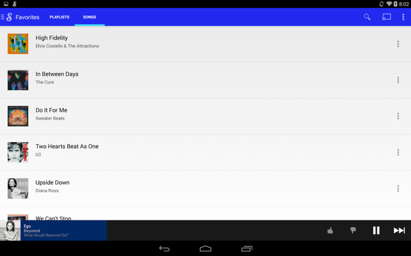 Songza能根據(jù)不同時(shí)間、不同地點(diǎn)、不同情境,隨機(jī)為用戶生成歌單,打開Songza,可以看到應(yīng)用下部的5個(gè)按鈕:“Concierge”、“我的歌單”、“流行”、“探索”和“選項(xiàng)”。其中“Concierge”(這是一個(gè)法語單詞,意思是賓館的迎賓部,軟件開發(fā)者起這么個(gè)名字,大約是為了表明用戶體驗(yàn)“賓至如歸”)是這款應(yīng)用最具特色的功能。打開這一界面后,Songza會(huì)首先識(shí)別系統(tǒng)時(shí)間,如“星期一下午”,然后列出6個(gè)自動(dòng)生成的歌單,比如下圖中的“夏日”、“提神”、“新歌”、“舞會(huì)”、“按摩”和“傳世名曲”。點(diǎn)擊任一歌單,即可欣賞與當(dāng)前情境相匹配的音樂。【更新日志】