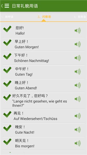 《基礎(chǔ)德語(yǔ)口語(yǔ)》,簡(jiǎn)單而實(shí)用,包含了最常用的基礎(chǔ)德語(yǔ)口語(yǔ)與短語(yǔ),隨身攜帶的德語(yǔ)老師,打造一口流利德語(yǔ)。最具代表性的短話和句子,包括了日常生活中的常用短語(yǔ)和句子,包括商店,旅行,酒店,餐館等不同大類。程序操作簡(jiǎn)便,界面直觀,內(nèi)容豐富,是學(xué)習(xí)口語(yǔ)的好幫手。【軟件特點(diǎn)】