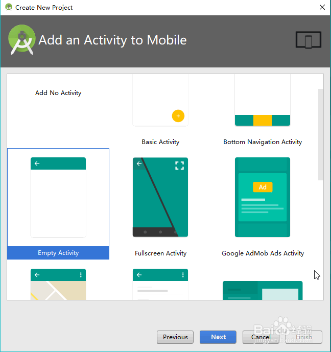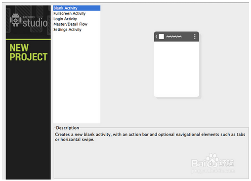 接著就會看到很多的Activity,有完全空白的Activity,有全屏Activity,有已經生成了菜單的Activity等,選擇一個合適的Activity。