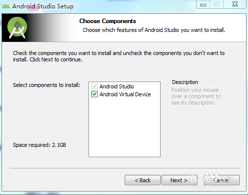 Android Studio是必須安裝的,Android Virtual Device可裝可不裝,這是模擬器,也有很多其他好用的模擬器,如:夜神模擬器和geneymotion模擬器等。