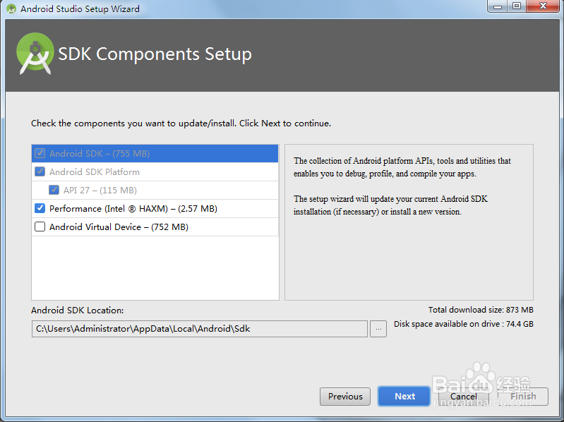 推薦提前安裝好SDK,是安卓開發(fā)環(huán)境,然后Android SDK Location就選擇自己安裝SDK的路徑即可。點擊下一步。