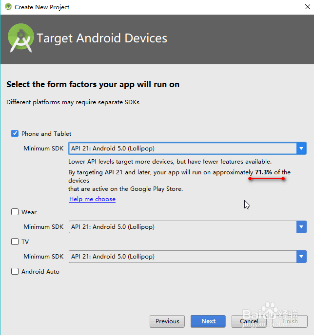 選擇你的項目針對的對象,有手機與平板電腦、智能穿戴設置、智能電視和Android Auto(無人駕駛),接著選擇好項目支持的最低端設備SDK版本,同時可以留意一下這個SDK版本所占的市場份額。