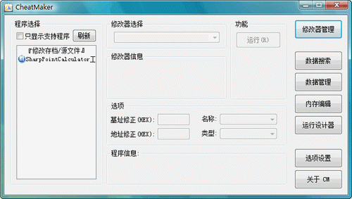 當(dāng)然你也可以將它視為普通的游戲修改器.CM(簡(jiǎn)稱)支持普通游戲修改器的大部分功能:數(shù)據(jù)搜索 數(shù)據(jù)修改 內(nèi)存管理地址管理...等等.而CM不僅僅是這樣 它可以制作基于任何程序的專用修改器 靜態(tài)修改 動(dòng)態(tài)修改皆可.當(dāng)然也包括任何游戲!它不僅支持PC程序還支持大多數(shù)的模擬器數(shù)據(jù)修改.使用靈活的修正地址功能 能固定的讀取模擬器游戲中任何地方的數(shù)據(jù).