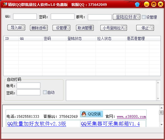 1、批量自動進(jìn)群2、批量自動設(shè)管理員3、批量自動邀請好友進(jìn)群4、批量刪除QQ群管理員5、自動打碼