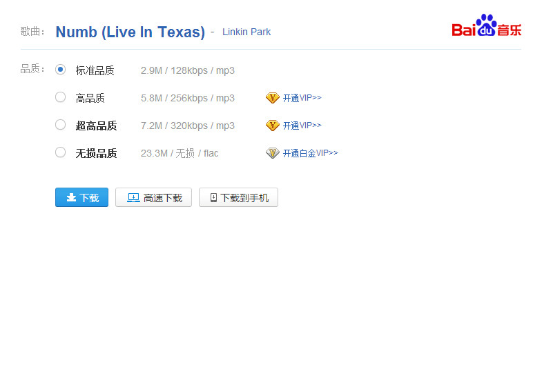 8、點(diǎn)擊下載歌曲的時候,百度音樂助手就直接講所有歌曲品質(zhì)的下載展示出來。用戶可以直接點(diǎn)擊高品質(zhì)無損音樂,無需會員帳號。