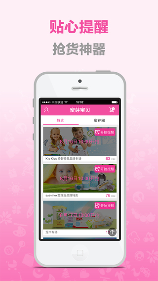 1、蜜芽寶貝APP,搶貨更快更準(zhǔn)更嗨皮!2、開(kāi)搶提醒,新品爆款各種心水寶貝不再錯(cuò)過(guò)!