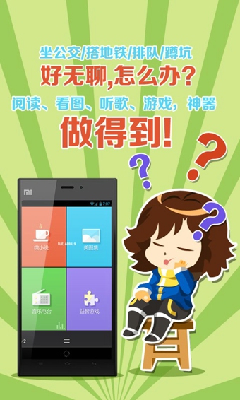 坐公交/搭地鐵/排隊(duì)/蹲坑,好無(wú)聊,怎么辦?笑話、閱讀、看圖、聽(tīng)歌、游戲,神器,做得到!磨時(shí)光神器功用: