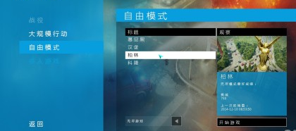 我們首先來看看開始游戲,點(diǎn)擊開始游戲之后,我們會進(jìn)入下一個菜單,這里有5個選項,分別是戰(zhàn)役,大規(guī)模行動,自由模式,多人游戲和退出..