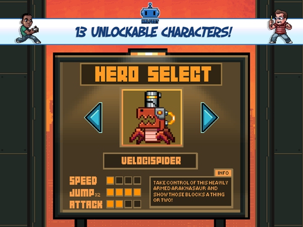 游戲中有13種額外的角色可以選擇,在進(jìn)入游戲前可以切換角色,每個(gè)角色的屬性各異,在選擇角色的界面可以看到他們的速度,彈跳力等屬性,解鎖角色的方法需要完成角色右下方框內(nèi)的任務(wù),例如跳到300m等。