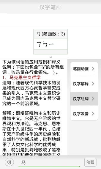 由于信息技術(shù)的發(fā)展,人們已經(jīng)習(xí)慣于在電腦、平板電腦及手機(jī)上打字,而大部分人已經(jīng)忘記漢字最基本的書寫筆畫及順序,本款軟件可以輕松搜索漢字的書寫筆畫和筆順,通過對每個漢字每個筆畫的拆解分析,使用戶了解筆畫順序,在此軟件中還增加動畫書寫筆畫功能,更加生動形象的描繪每個漢字的筆畫、筆順和精髓。該軟件的主要目的是幫助剛剛起步學(xué)漢字的小學(xué)生和老外了解每個漢字的書寫順序,為學(xué)習(xí)漢字打下扎實(shí)的書寫基礎(chǔ)。【更新日志】