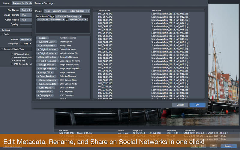 你可以給有意義的名稱來轉(zhuǎn)換照片構(gòu)建文件名中的“親”的方式 - 用文字和標記:索引,拍攝日期,原來的名字,圖像的寬度,“查找與替換”等。此外,還可以復制到時候,重命名照片另一個文件夾無需任何轉(zhuǎn)換。