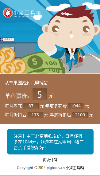 1、打開地鐵票價計(jì)算器,選擇起點(diǎn)路線站點(diǎn)和終點(diǎn)路線和站點(diǎn),點(diǎn)擊start2、然后軟件就會幫你計(jì)算出單程票價。同時還為你算出漲價之后,每月、每年多花的費(fèi)用以及每月每年折扣費(fèi)用。