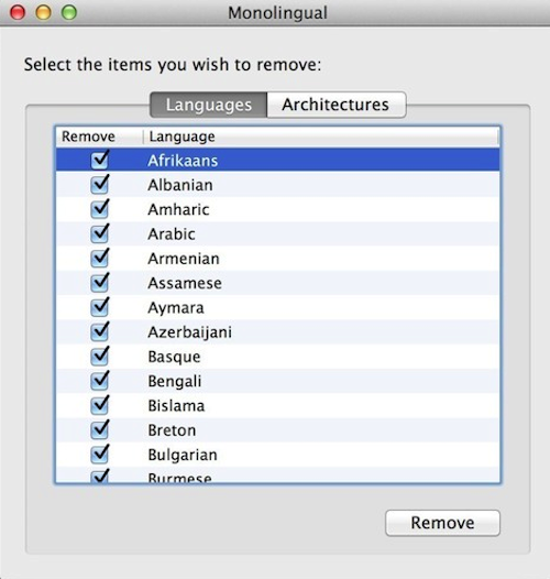 monolingual多余語言環(huán)境清除工具。當(dāng)你安裝OSX時,系統(tǒng)會提供一些其他語言的環(huán)境文件,許多軟件安裝時,也會提供一些不同的語言包,這款軟件就能幫你們清理那些多余的語言壞境。