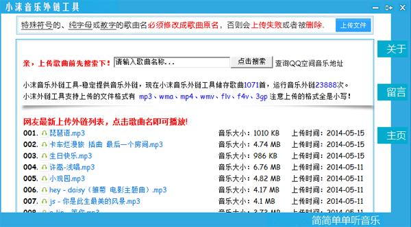 1.特殊符號(hào)、純字母或歌曲名必須修改成歌曲原名,否則會(huì)上傳失敗或者被刪除2.小沫音樂外鏈工具-穩(wěn)定提供音樂外鏈,現(xiàn)在小沫音樂外鏈工具儲(chǔ)存歌曲1071首,運(yùn)行音樂外鏈23888次