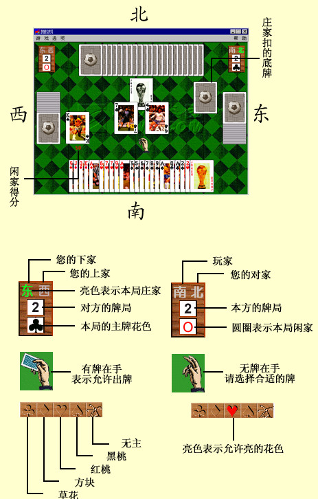 6、每局牌在結(jié)束之前,如莊家多牌或少牌,則倒莊,如對(duì)家多牌或少牌則莊家升級(jí)。