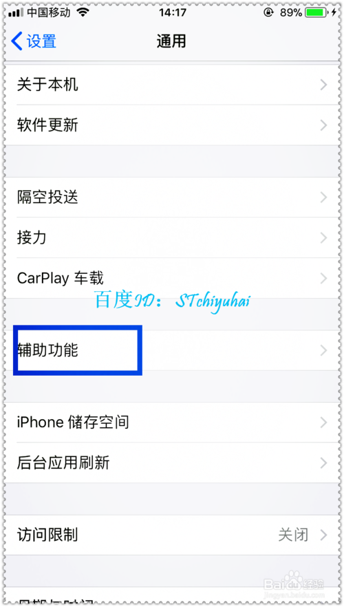 進(jìn)入通用設(shè)置界面后找到輔助功能設(shè)置一欄,點(diǎn)擊進(jìn)入輔助功能界面,找到AssistiveTouch,新版本已經(jīng)改名為“輔助控制”。
