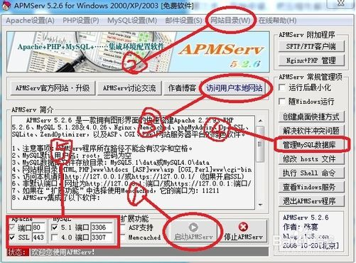 2是網(wǎng)站文件存放位置,這里是你存放的盤符\APMServ5.2.6\www\htdocs這個目錄是網(wǎng)站文件存放位置。