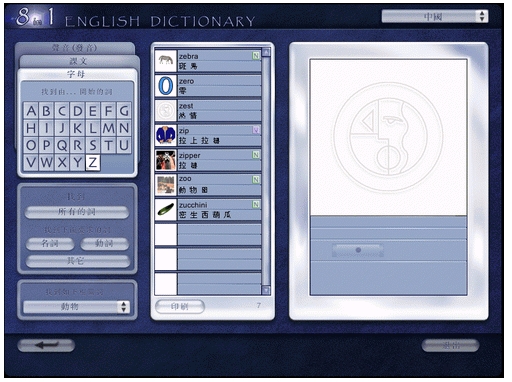 *獨(dú)有的8合1英語(yǔ)詞典-可以用10種不同的方式來(lái)搜索:選擇來(lái)自39個(gè)主題(動(dòng)物,顏色,衣物等);可以任意搜索字母或字母的組合;也可以只選擇動(dòng)詞或名詞進(jìn)行學(xué)習(xí)。