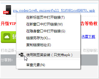 如果您需要下載apk并安裝到手機(jī)上,可以直接在apk的下載鏈接點(diǎn)擊右鍵,選擇【使用豌豆莢下載】即可啟動(dòng)豌豆莢自動(dòng)下載并安裝apk。