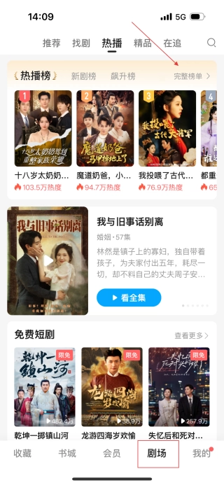 進(jìn)入劇場頁,點擊完整榜單查看熱播劇排行。